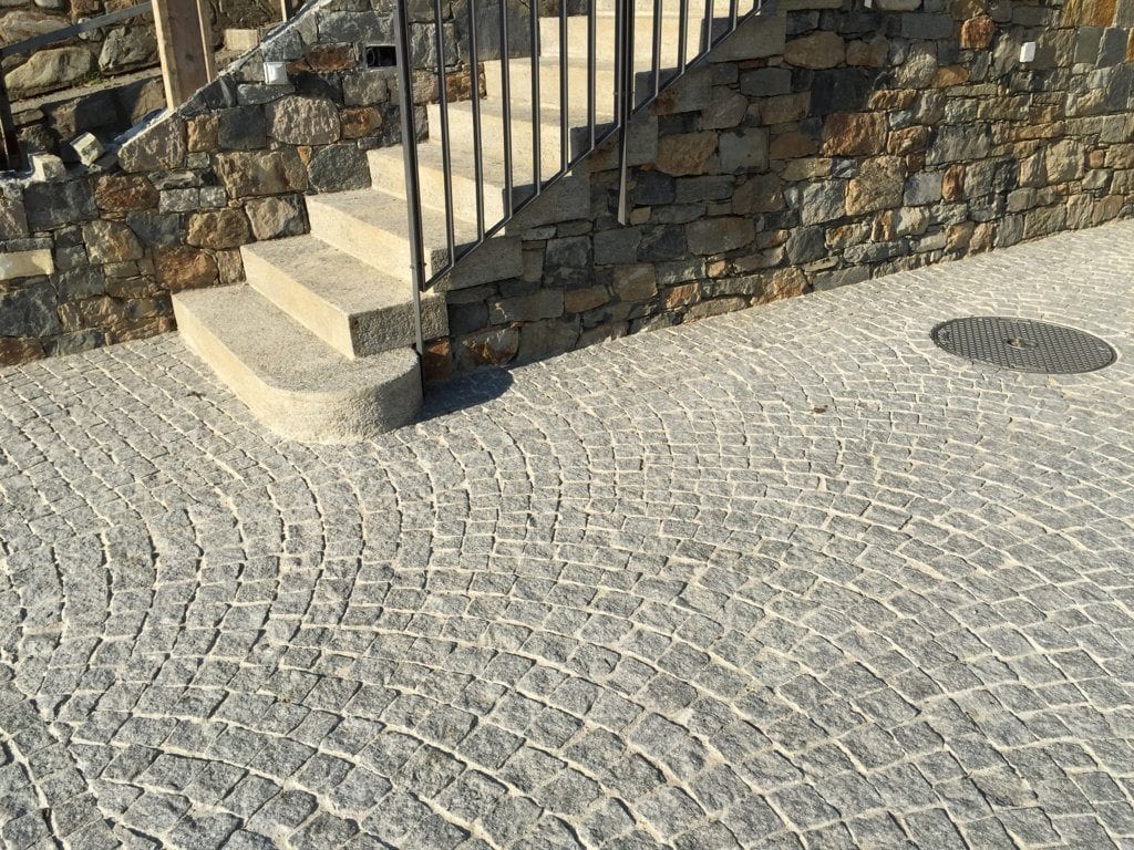 Vengono posate su betoncino, fresco su fresco o su letto di sabbia. La fugatura viene trattata con malta di cemento ed eventualmente, con rete di rinforzo nel betoncino, se carrozzabili. Esecuzioni di delimitazioni con lastre di cemento beola o granito.